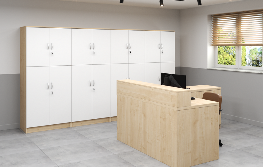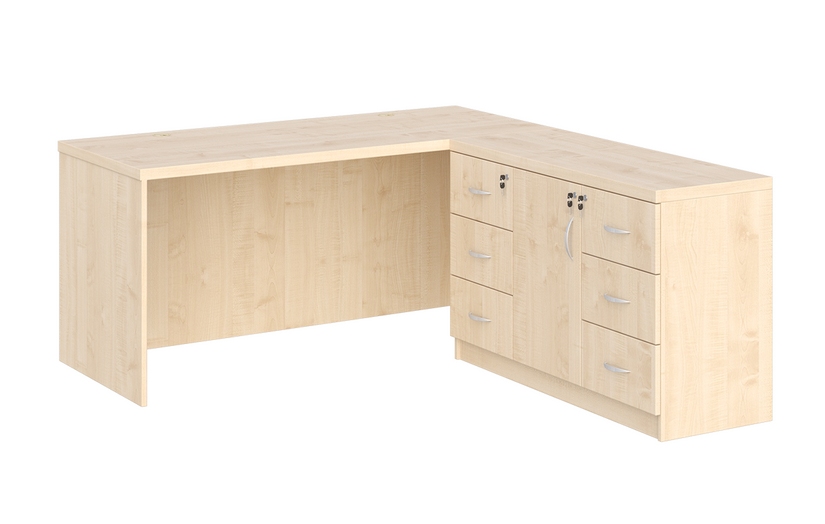 - Cały przód biurka zabudowany jest płytą laminowaną gr. 18 mm, dzięki czemu biurko może mieć funkcję biurka/recepcji.