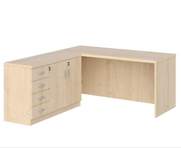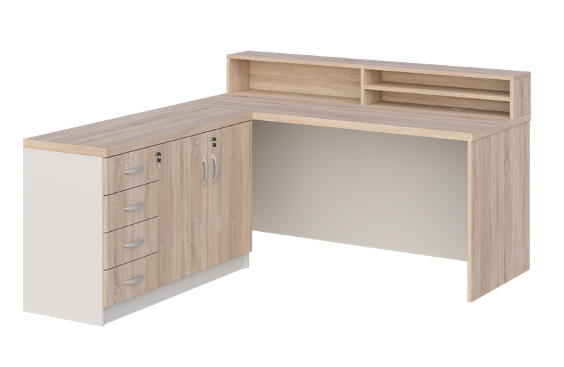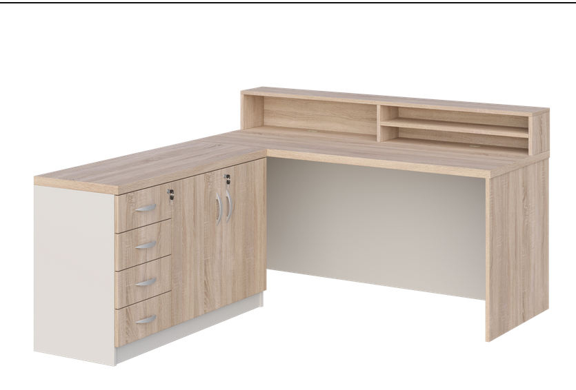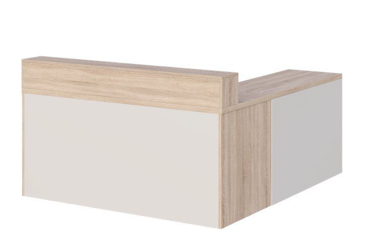 - Cały przód biurka zabudowany jest płytą laminowaną gr. 18 mm, dzięki czemu biurko może mieć funkcję biurka/recepcji.