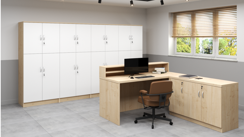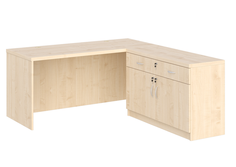 - Cały przód biurka zabudowany jest płytą laminowaną gr. 18 mm, dzięki czemu biurko może mieć funkcję biurka/recepcji.