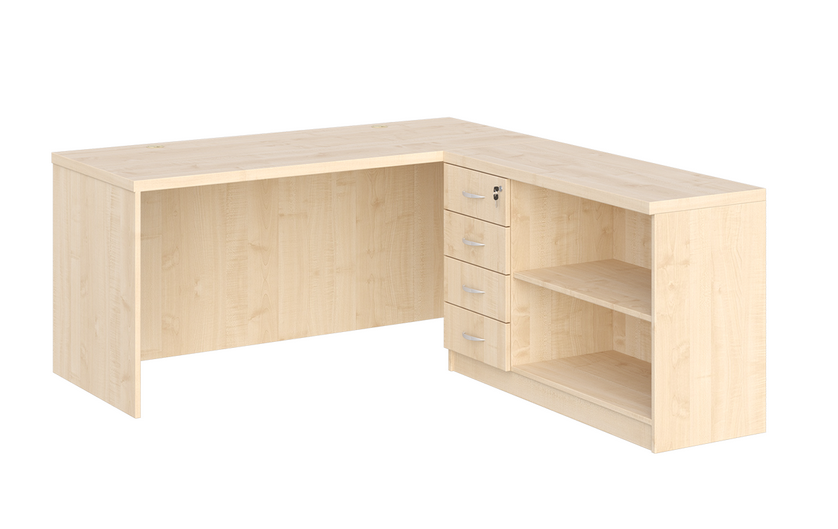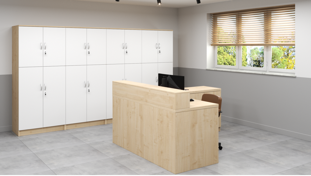 - Cały przód biurka zabudowany jest płytą laminowaną gr. 18 mm, dzięki czemu biurko może mieć funkcję biurka/recepcji.