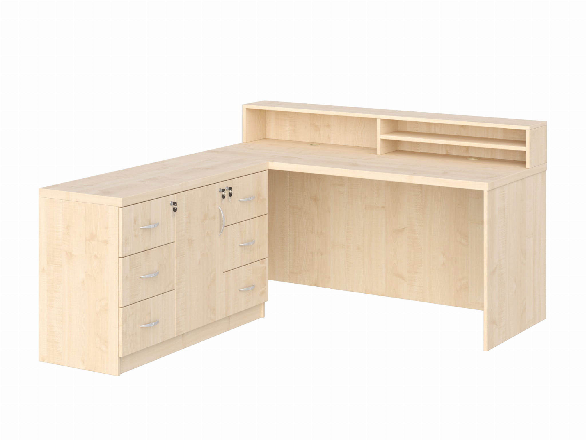 - Cały przód biurka zabudowany jest płytą laminowaną gr. 18 mm, dzięki czemu biurko może mieć funkcję biurka/recepcji. Do wyboru dwie długości biurkai nadstawki: 1600 mm lub 1800 mm.