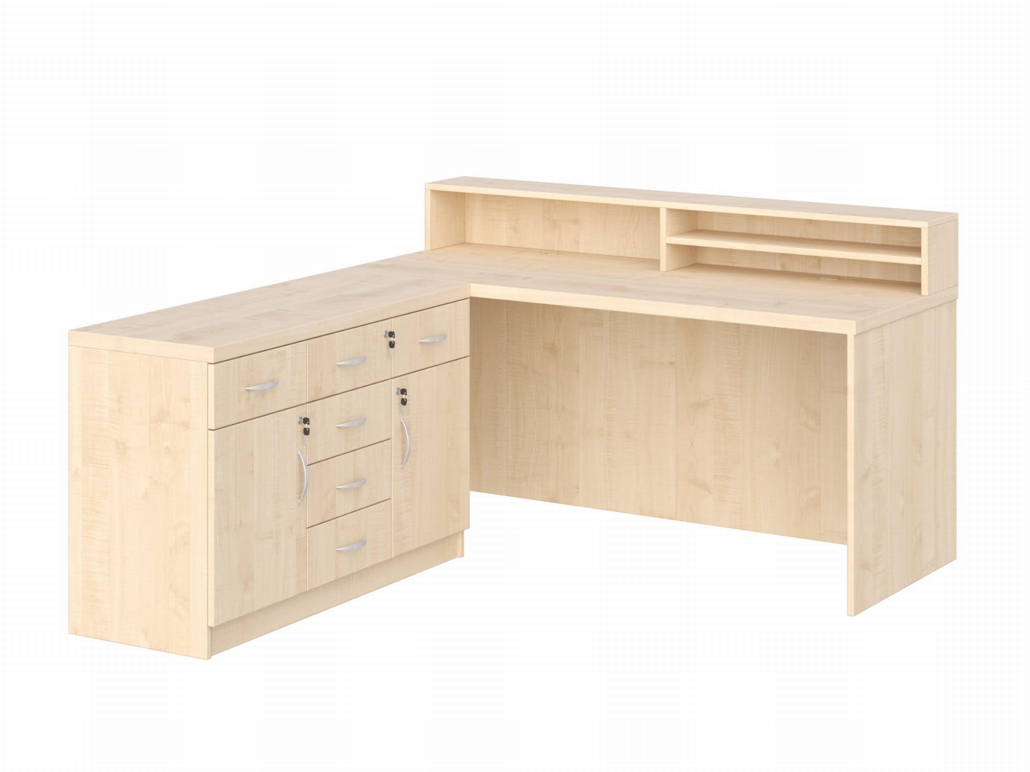 - Cały przód biurka zabudowany jest płytą laminowaną gr. 18 mm, dzięki czemu biurko może mieć funkcję biurka/recepcji.