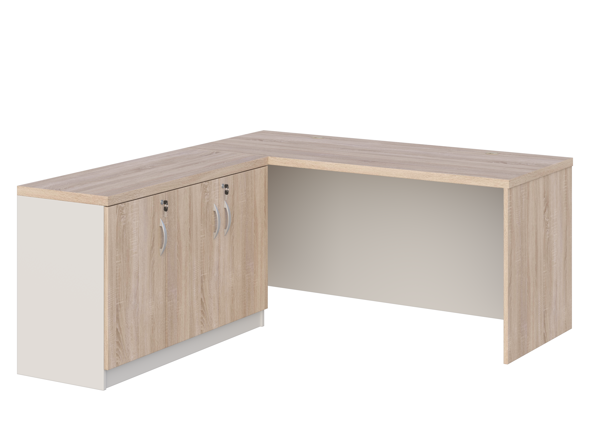 - Cały przód biurka zabudowany jest płytą laminowaną gr. 18 mm, dzięki czemu biurko może mieć funkcję biurka/recepcji.