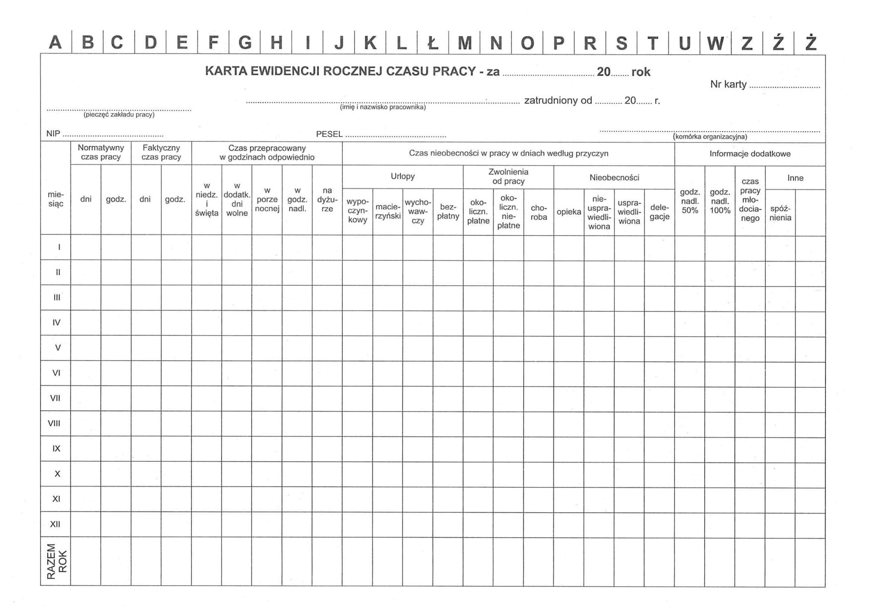 Karta ewidencji rocznej czasu pracy A4