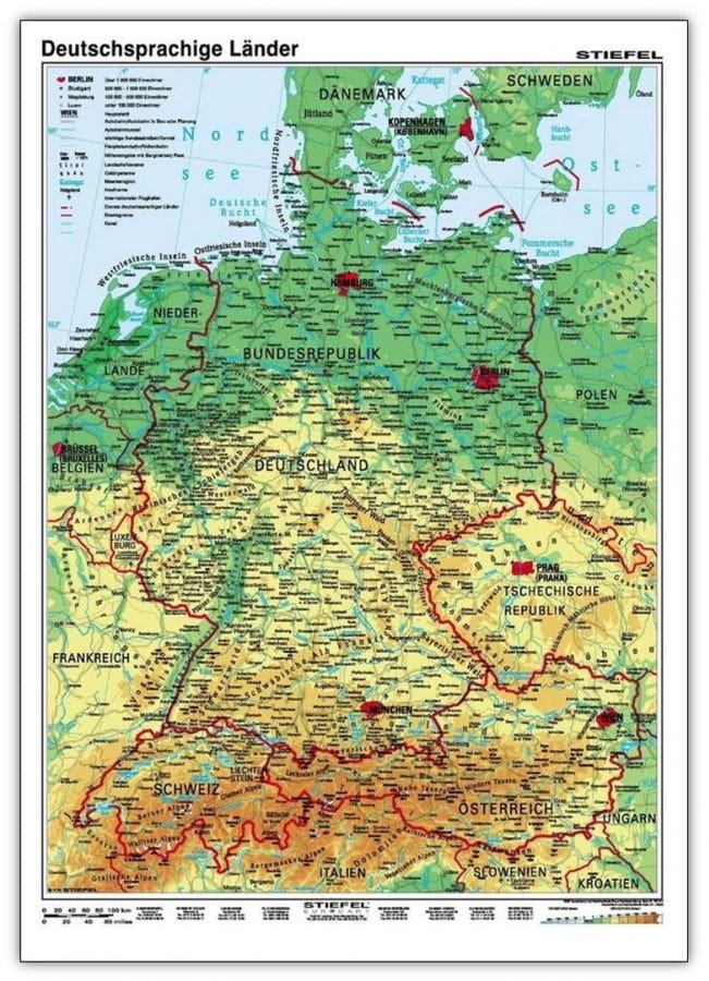 Kraje niemieckojęzyczne to plansza jednostronna w formacie 120x160 cm, laminowana oprawiona w drewniane wałki z zawieszką w języku niemieckim.