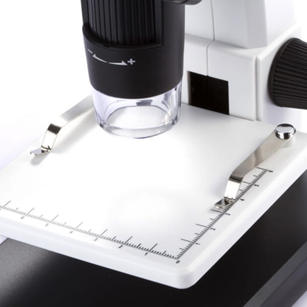 Stolik mikroskopu jest wyposażony w skalę pomiarową (8 cm wzdłuż osi x, 6 cm wzdłuż osi y) oraz dwa zaciski do przymocowania próbki pod kamerą.