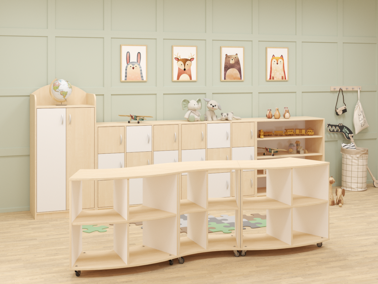 Regał można zestawiać z innymi regałami z tej serii, tj. Primo 233 do 235 oraz 244 do 247 tworząc jeden dłuższy ciąg regałów np. do oddzielenia różnych stref w sali edukacyjnej.