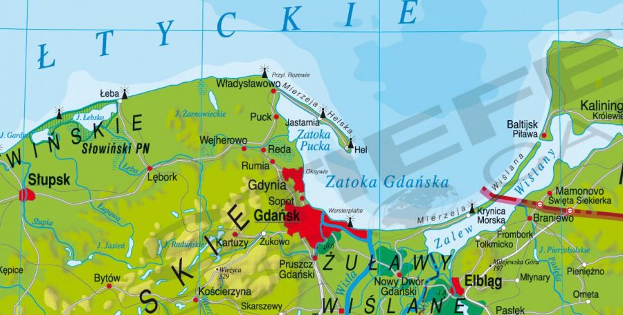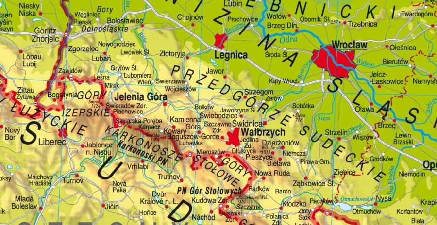 Polska fizyczna konturowa to mapa dwustronna w formacie 160x120cm, laminowana, oprawiona w drewniane wałki, w języku polskim.
