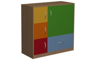 - Szafka posiadająca 3 kwadratowe skrytki zamykane osobnymi, jednoskrzydłowymi drzwiczkami z lewej strony.