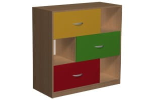 - Szafka posiadająca 3 szerokie szuflady i 3 otwarte półki.