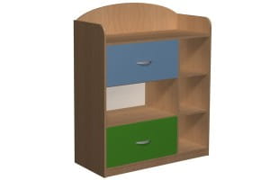 - Szafka z nadstawką posiadająca 3 otwartymi wnękami po prawej stronie oraz 2 szufladami i półką po lewej.