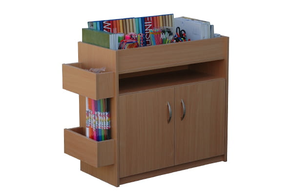- Z boku szafki dodatkowa kieszeń na bibułę, rolki brystolu lub plakaty (+ 120 mm do szerokości szafki).