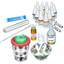 Pakiet zawiera nie tylko uzupełnienie wszystkich niezbędnych odczynników płynnych oraz sypkich w takich samych ilościach i objętości jak zestaw podstawowy, ale ponadto posiada kilka elementów nowych, których pojawienie się jest odpowiedzią na potrzeby praktyczne jakie zgłaszali do nas nauczyciele użytkujący nasze walizki w terenie.
